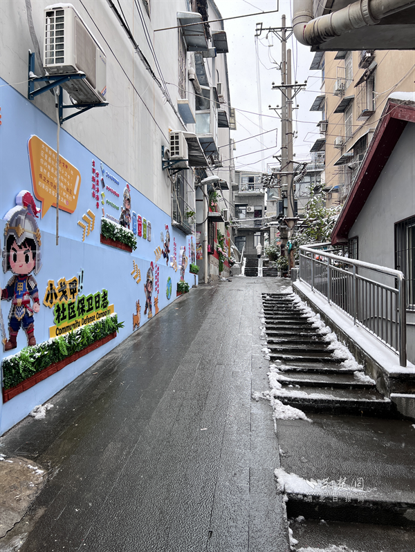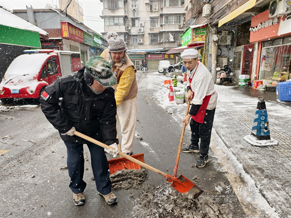 20日清晨,糧道街胭脂路部分路段冰雪堆積,步行、車行存在安全隱患。沿街商戶主動(dòng)設(shè)立板凳、雪糕筒提醒路人繞行,并拿起掃把清掃路邊積雪,方便路人安全通過(guò)?!斑@是武漢的第一場(chǎng)雪,雖然很美,但路滑容易摔跤,我們?cè)琰c(diǎn)把門口掃干凈,大家走路就放心了?!币晃簧虘衾习逡贿吂讱庖贿呎f(shuō)道。這一把把掃帚不僅掃去了積雪,更暖了人心,商戶們用最樸實(shí)的行動(dòng),在寒冬街頭筑起了一道溫暖的安全防線,展現(xiàn)了“社區(qū)是我家”的主人翁精神。