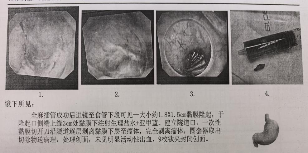 患者劉先生因反復(fù)出現(xiàn)吞咽不適、進(jìn)食梗阻感前往醫(yī)院就診。經(jīng)胃鏡檢查,醫(yī)生發(fā)現(xiàn)其食管下段存在隆起性病變,消化內(nèi)科Ⅱ病區(qū)專家團(tuán)隊(duì)結(jié)合患者病情進(jìn)行會(huì)診后,決定采用STER技術(shù)為其開展微創(chuàng)治療。手術(shù)在全身麻醉下進(jìn)行,手術(shù)團(tuán)隊(duì)在患者食管黏膜上建立微小“隧道”,通過該隧道精準(zhǔn)切除病變組織,隨后用9枚鈦夾妥善夾閉創(chuàng)口,整個(gè)手術(shù)過程出血極少,進(jìn)展順利。