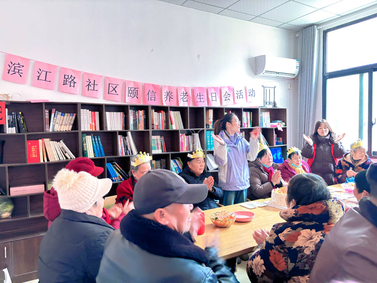 濱江路社區(qū)的活動以“情暖冬日 愛在頤信”為主題,活動現(xiàn)場布置雅致,粉色主題橫幅醒目溫馨,四位壽星頭戴金燦燦的生日帽,圍坐在一起,眼底滿是期待,臉上漾著幸福的笑意。