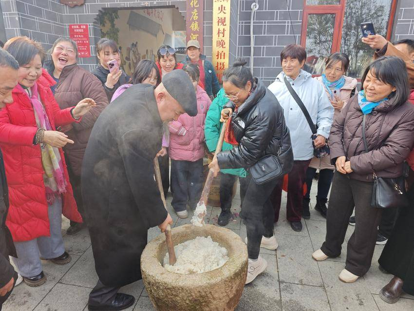 宣化店鎮(zhèn)河西村楊灣,游客沉浸式觀看大型行進(jìn)式紅色情景劇《1946?中原突圍》,在槍聲音效與實(shí)景中,重溫烽火歲月。在“新春祈福墻”前,游客們提筆寫下“國(guó)泰民安”“鄉(xiāng)村振興”等新春愿望。在中原軍區(qū)舊址前,工作人員為游客送上“紅色新春賀卡”。傳統(tǒng)年俗體驗(yàn)區(qū),舞獅、龍船等非遺表演輪番登場(chǎng),游客們舉起手機(jī)記錄下這喜慶瞬間,游客們親手書寫春聯(lián),拓印福字,制作竹燈籠,將滿滿的年味帶回家。游客們跟著村民一起打糍粑,滿滿的鄉(xiāng)村煙火氣。