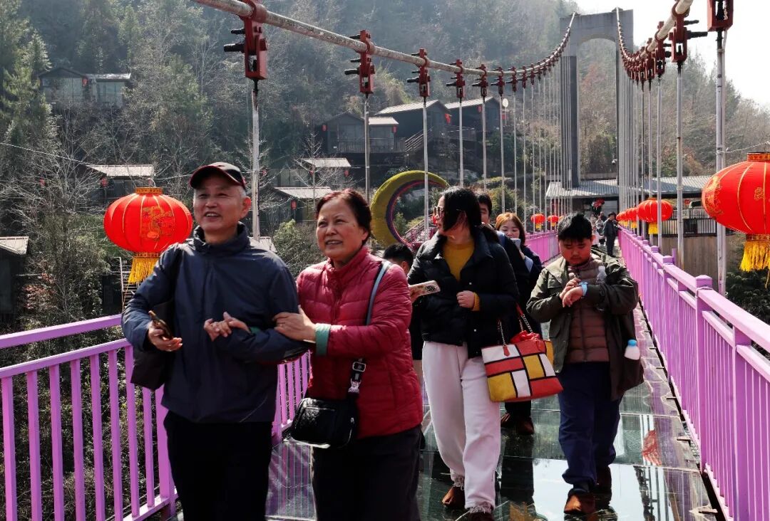 景區(qū)內(nèi),玻璃橋上歡呼聲此起彼伏,絕壁棧道上游客們舉家拍照打卡,地心谷底的潺潺流水與游客的歡聲笑語交織成一幅熱鬧的新春畫卷。