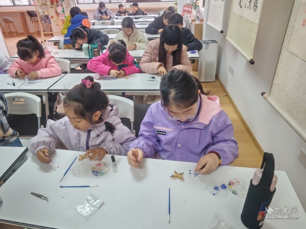 非遺胸針DIY環(huán)節(jié),“閱讀媽媽”一對(duì)一指導(dǎo)大家如何將黃鶴樓元素、荊楚紋樣融入指尖創(chuàng)作。一枚枚精美的胸針逐漸成型,文化記憶也被定格于方寸之間。當(dāng)孩子們將親手制作的胸針佩戴于胸前時(shí),臉上洋溢著滿滿的成就感與自豪感。