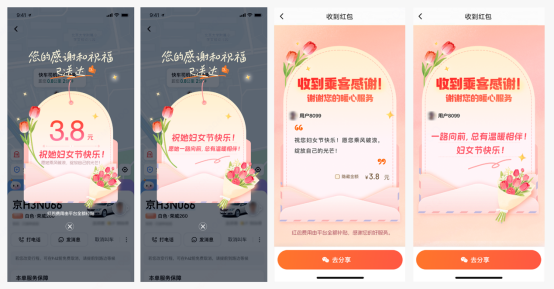 乘客在滴滴App內(nèi)為女司機(jī)送祝福和司機(jī)側(cè)收到的祝福頁(yè)面