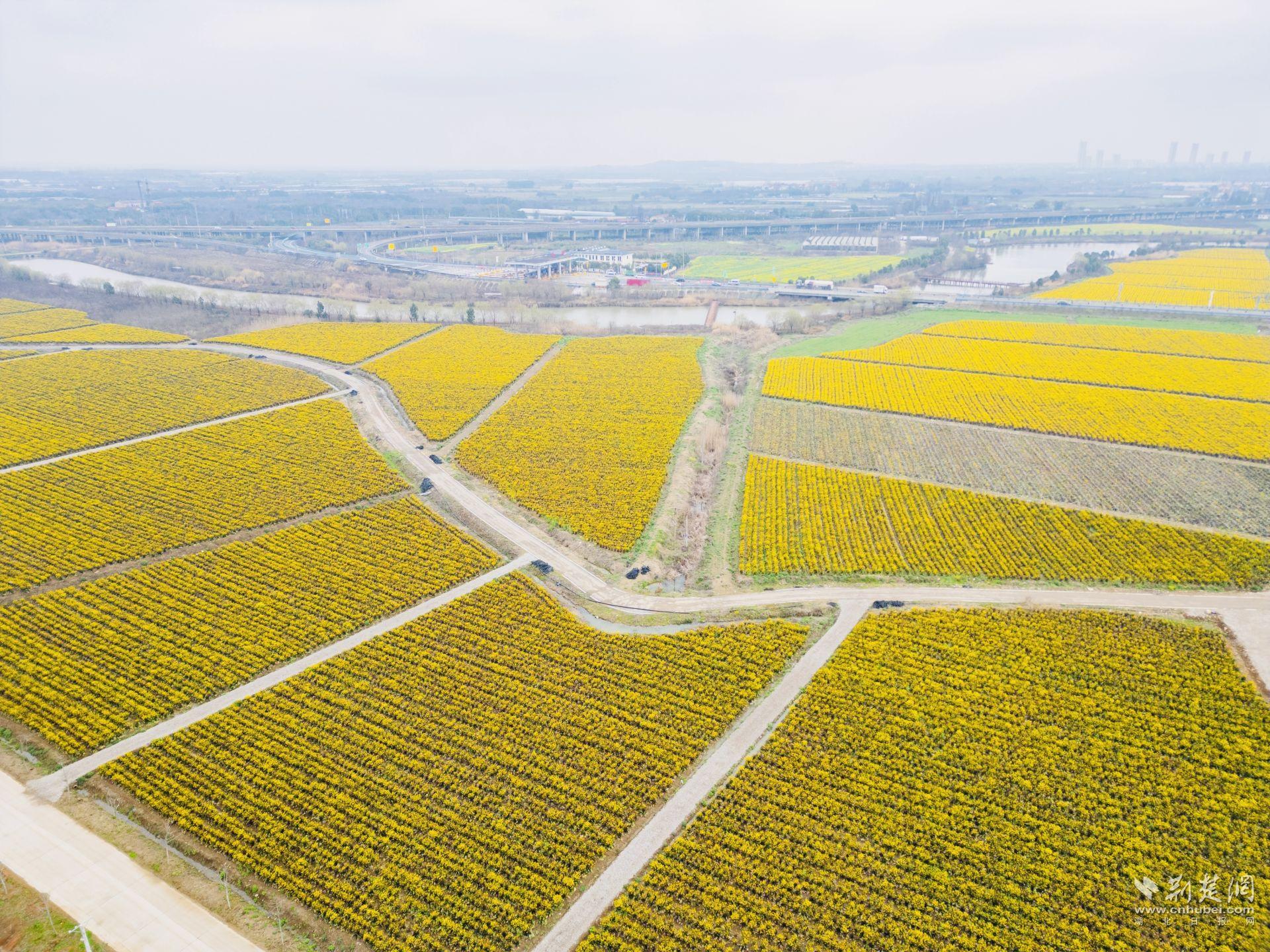 春節(jié)前,基地剛剛完成最后一茬菜薹的采摘,如今卻迎來了生命的“高光時(shí)刻”。基地內(nèi)的洪山菜薹全面盛放,匯成一片金色的海洋。春風(fēng)拂過,花浪翻涌,紫色的菜薹葉與粗壯的菜薹桿在花海中若隱若現(xiàn),形成一幅層次豐富、生機(jī)勃勃的田園畫卷,成為高速路口一道亮麗的風(fēng)景線。