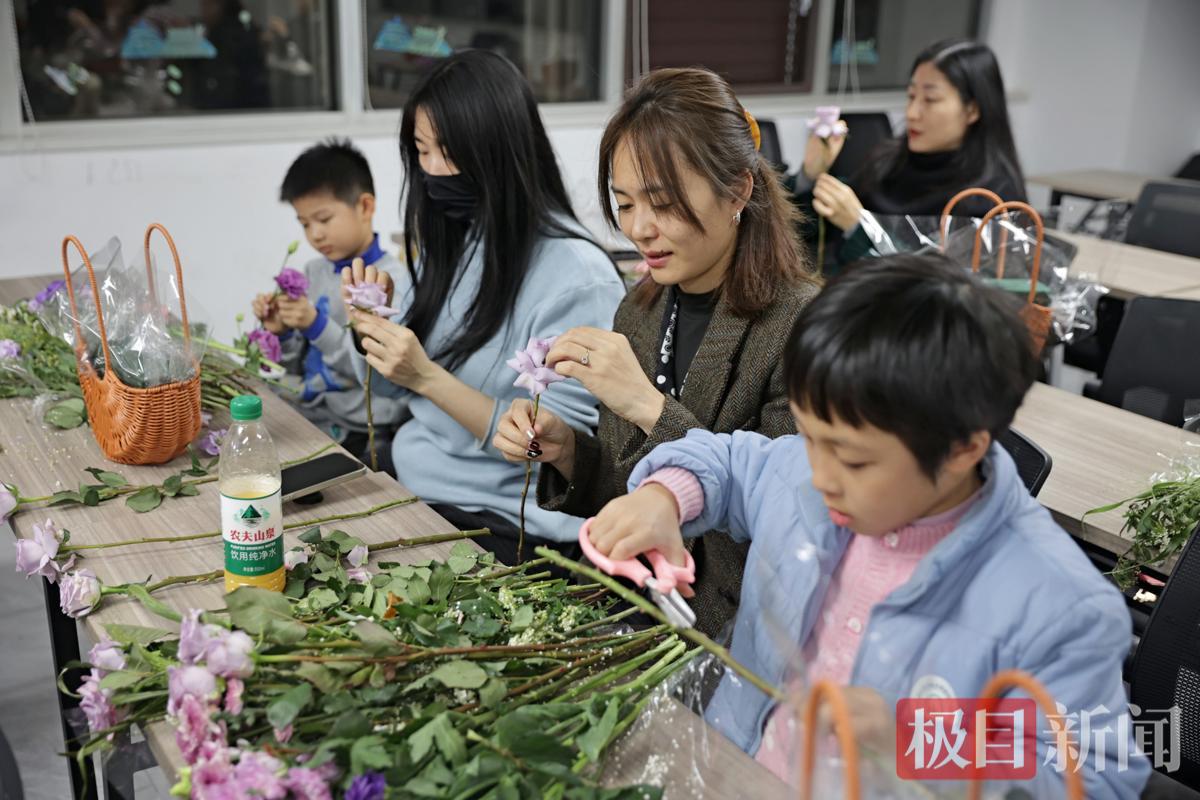 親子家庭在沉浸式體驗(yàn)插花藝術(shù)