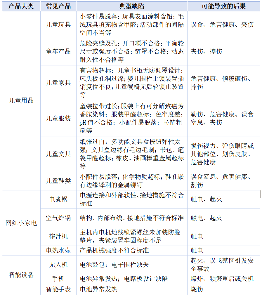 荊楚網(wǎng)(湖北日報(bào)網(wǎng))訊(通訊員張璐)您有沒有想過,每天用的、孩子玩的、家里擺的那些再尋常不過的東西,可能藏著看不見的安全隱患?其實(shí),這類因設(shè)計(jì)、制造或警示等原因,在某一批次中普遍存在安全風(fēng)險(xiǎn)的消費(fèi)品,有一個(gè)官方的名字——缺陷產(chǎn)品。今天,湖北省缺陷產(chǎn)品管理中心梳理了生活中幾類常見的缺陷產(chǎn)品及其典型缺陷(見下方表格),幫您練就一雙“火眼金睛”,守護(hù)家人安全。