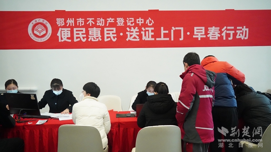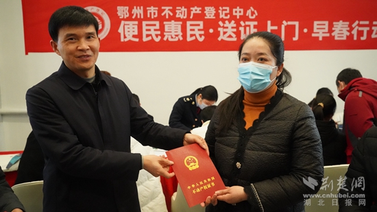 荊楚網(湖北日報網)訊(通訊員 周婷)3月22日上午,鄂州市不動產登記中心開展“便民惠民送證上門”活動,將辦證服務窗口延伸到楚天都市鑫園售樓部,現(xiàn)場接受購房群眾申請,現(xiàn)場受理,現(xiàn)場發(fā)證。