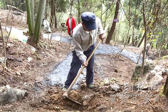 在山上的一片陡坡上,記者看到,二十多名村民正在熱火朝天地鋪路,山上不時還有來來往往爬山的村民,原來,今天是該村周家灣達(dá)觀山生態(tài)休閑公園試開放的第一天。