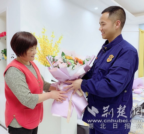 圖為消防指戰(zhàn)員親手送鮮花給母親?!⑻摂z
