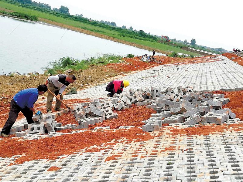 工人在斧頭湖湖堤鋪設(shè)植草磚