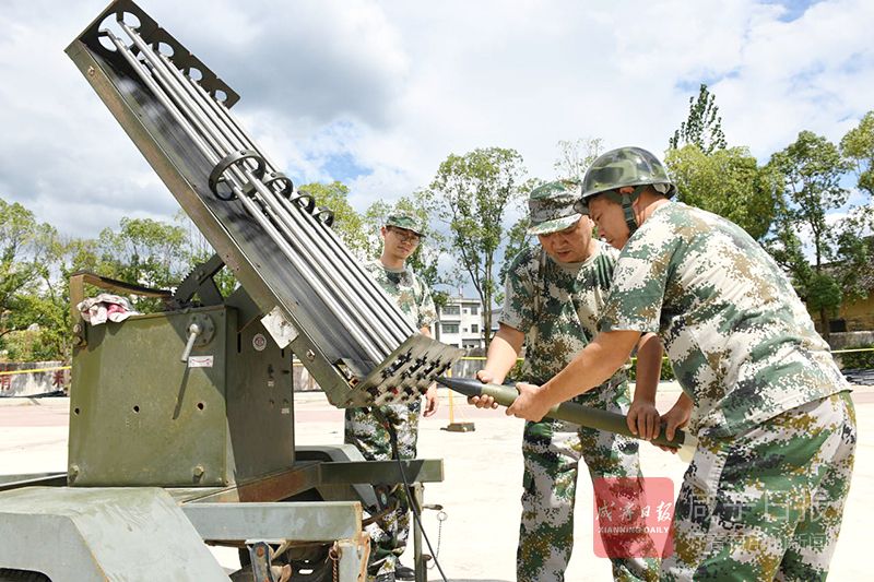 26日,在崇陽縣港口鄉(xiāng)中學(xué),該縣氣象局工作人員正在此架設(shè)火箭炮,守候?qū)α髟茖樱プ∮欣麜r機實施人工增雨抗旱作業(yè)。