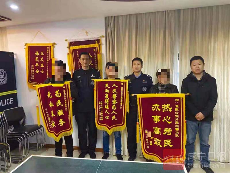 咸寧網(wǎng)訊(香城都市報記者 方達(dá)星 通訊員 胡微) 11月18日上午,山東騰州的楊先生、浙江上虞的倪女士以及江西上饒的張先生三人,將三面錦旗送到溫泉巡特警手中。他們連連道謝,感激之情溢于言表。
