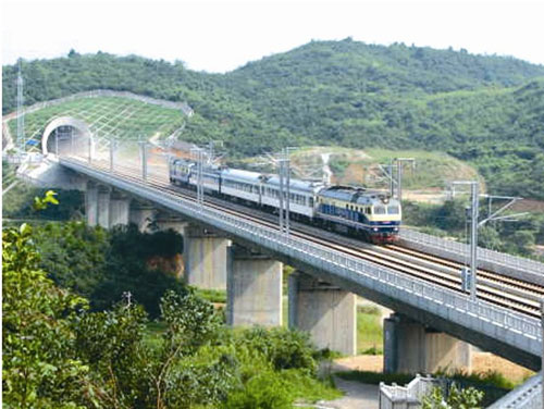 大瑤山位于湘粵交界之處,素有“南嶺險關(guān)”之稱。上世紀80年代,修建衡陽到廣州復線,建設者用7年時間在這里修建隧道,全長14公里,是當時國內(nèi)最長的雙線電氣化隧道。這次,武廣客專的方案是修建隧道群,由1號、2號、3號隧道組成,橋隧相連。3條隧道全長25公里,用了3年半全部竣工。
