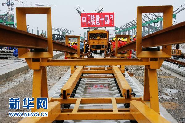 資料圖片:7月17日,中國鐵建十四局集團京滬高鐵鋪軌工班的工人們正在鋪設(shè)通道,為正式鋪軌進行準備。京滬高鐵先導(dǎo)試驗段北段將于7月19日開始率先從徐州向蚌埠鋪軌,南段將于8月中旬從南京向蚌埠鋪軌,10月底將完成試驗段鋪軌。京滬高速鐵路全長1318公里,全線縱貫京津滬三大直轄市和河北、山東、安徽、江蘇四省,是我國目前最長的客運專線之一。新華社發(fā)(劉文攝)